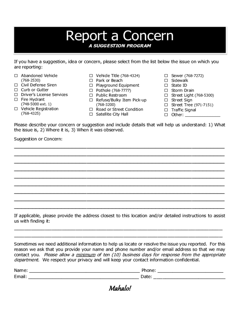 Report a Concern A SUGGESTION Program you have a suggestion, idea or concern, please select from the list below the issue on which you are reporting: Abandoned Vehicle (7682530) Civil Defense Siren