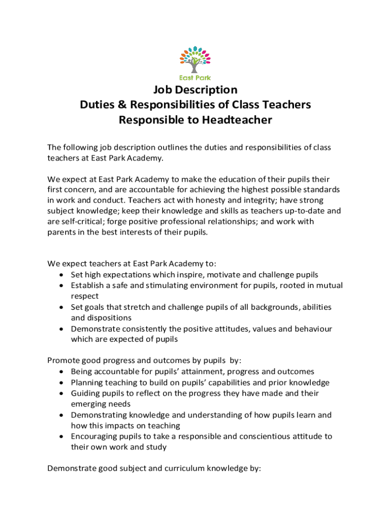 Job Description Duties & Responsibilities of Class Teachers Responsible to Headteacher The following job description outlines the duties and responsibilities of class teachers at East Park Academy.