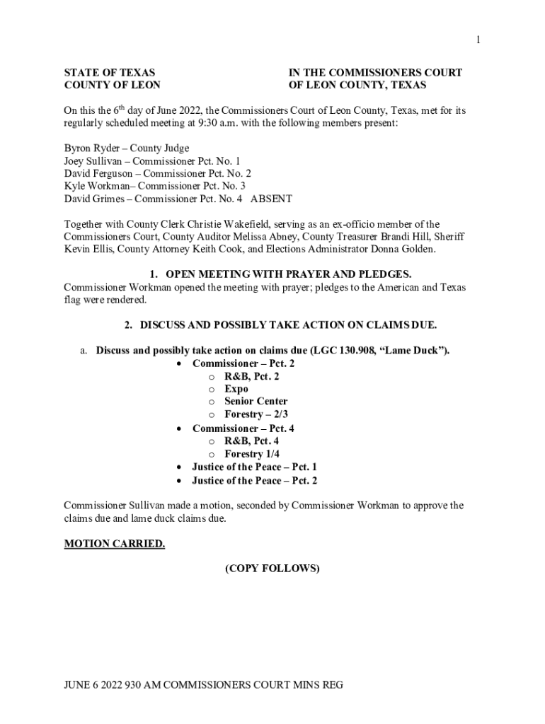 1 STATE OF TEXAS COUNTY OF LENIN THE COMMISSIONERS COURT OF LEON COUNTY, Season this the 6th day of June 2022, the Commissioners Court of Leon County, Texas, met for its regularly scheduled meeting