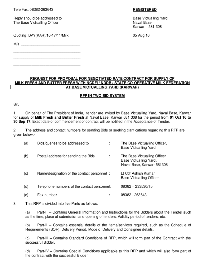 Tell Fax: 08382263643REGISTEREDReply should be addressed to The Base Victualling Officers Victualling Yard Naval Base Karma 581 308Quoting: BVY(CAR)/1617/11/Milk05 Aug 16M/s. ___ ___ ___ ___REQUEST