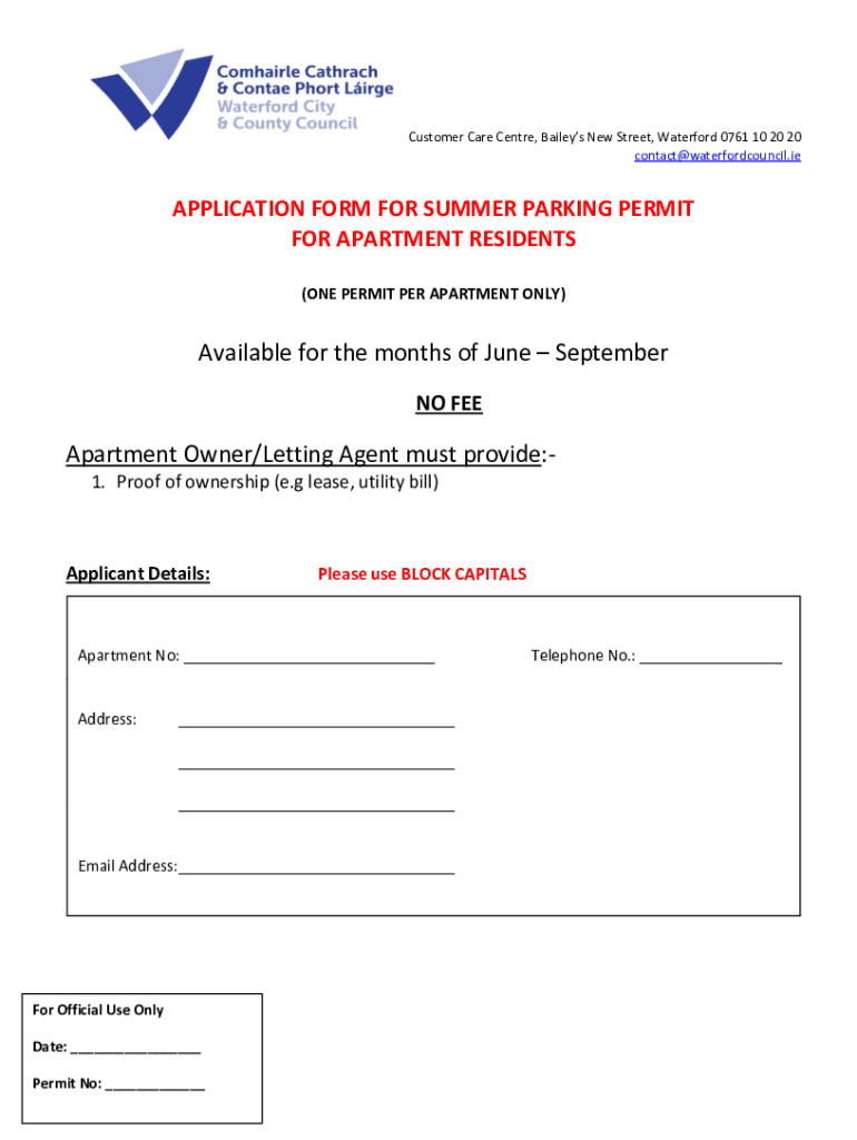 Customer Care Center, Baileys New Street, Waterford 0761 10 20 20 contact@waterfordcouncil.ieAPPLICATION FORM FOR SUMMER PARKING PERMIT FOR APARTMENT RESIDENTS (ONE PERMIT PER APARTMENT ONLY)Available
