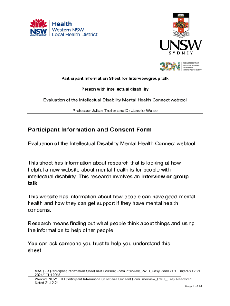 Participant Information Sheet for Interview/group talk Person with intellectual disabilityEvaluation of the Intellectual Disability Mental Health Connect web tool Professor Julian Trollop and Dr Janelle
