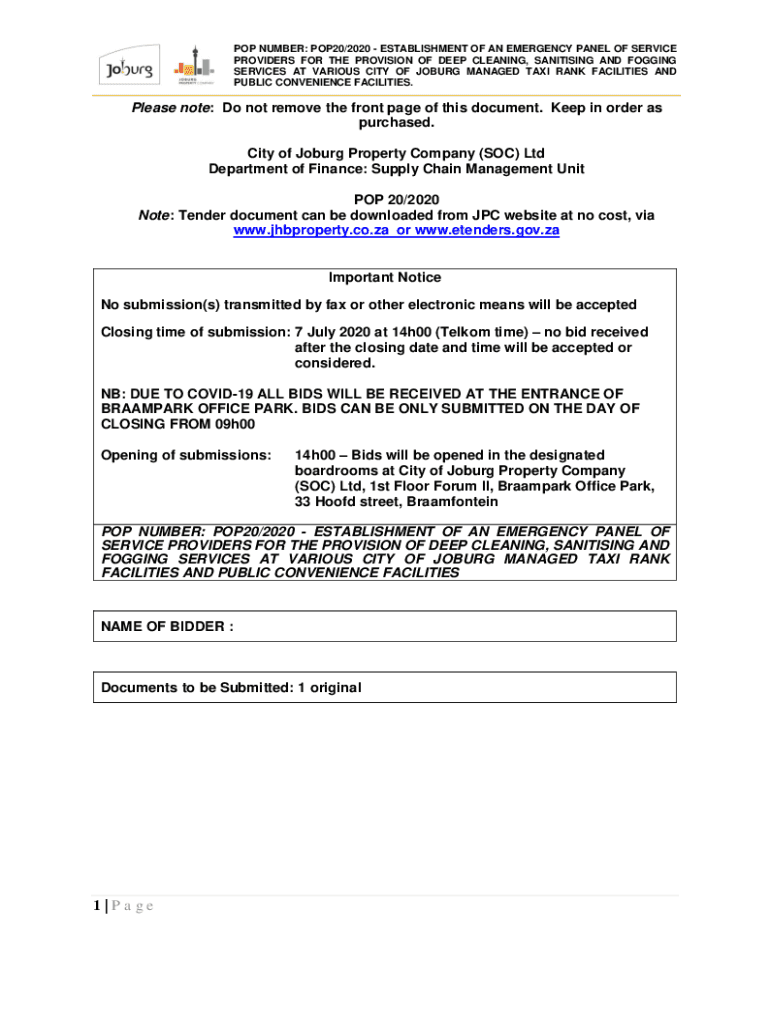 POP NUMBER: POP20/2020 ESTABLISHMENT OF AN EMERGENCY PANEL OF SERVICE PROVIDERS FOR THE PROVISION OF DEEP CLEANING, Sanitizing AND FOGGING SERVICES AT VARIOUS CITY OF JOB URG MANAGED TAXI RANK FACILITIES