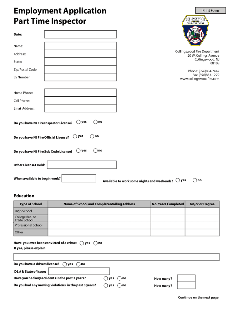 Employment Application Part Time InspectorPrint Format: Name: Collingwood Fire Department 20 W. Collins Avenue Collingwood, NJ 08108Address: State: Zip/Postal Code:Phone: (856)8547447 Fax: (856)8541279