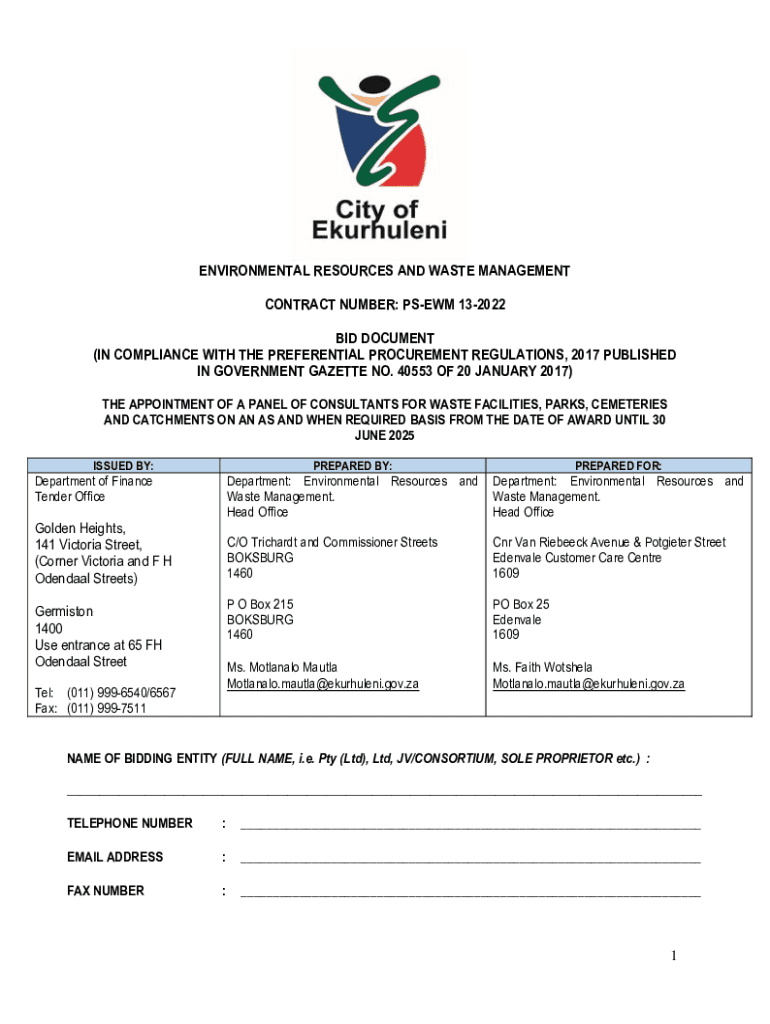ENVIRONMENTAL RESOURCES AND WASTE MANAGEMENT CONTRACT NUMBER: POEM 132022 BID DOCUMENT (IN COMPLIANCE WITH THE PREFERENTIAL PROCUREMENT REGULATIONS, 2017 PUBLISHED IN GOVERNMENT GAZETTE NO. 40553