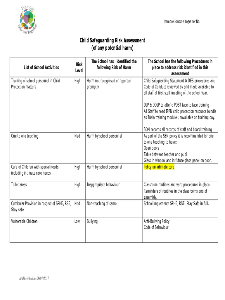 Tram ore Educate Together Child Safeguarding Risk Assessment