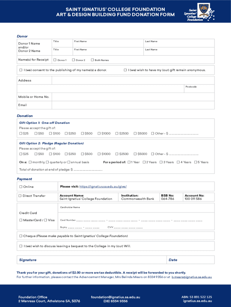 SAINT IGNATIUS COLLEGE FOUNDATION ART & DESIGN BUILDING FUND DONATION Foredoom Donor 1 Name and/or Donor 2 NameFirst Nameless NameTitleFirst Nameless Name Donor 1Name(s) for ReceiptTitle Donor 2 Both