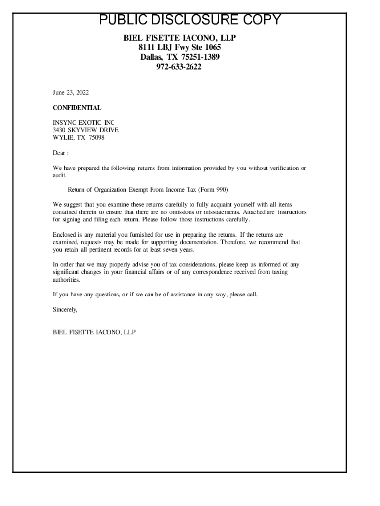 PUBLIC DISCLOSURE COPY BIEL ROSETTE ICON, LLP 8111 LBJ Fwy Ste 1065 Dallas, TX 752511389 9726332622 June 23, 2022, CONFIDENTIAL INSANE EXOTIC INC 3430 BAYVIEW DRIVE WYLIE, TX 75098 Dear : We have