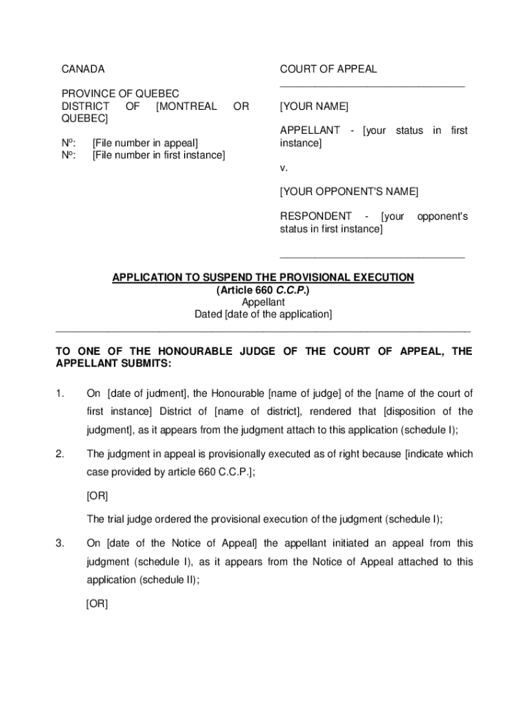 CANADA PROVINCE OF QUEBEC DISTRICT OF [MONTREAL QUEBEC] No: No:COURT OF APPEAL ___ OR[File number in appeal] [File number in first instance][YOUR NAME] APPELLANT [your status in first instance] v.
