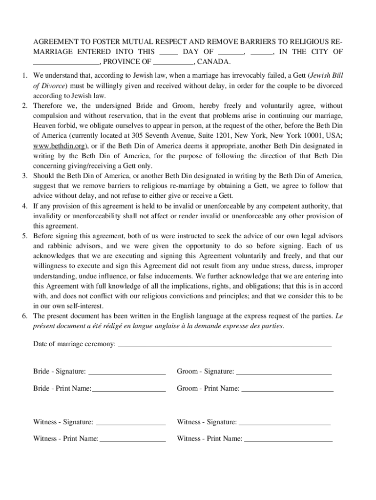 AGREEMENT TO FOSTER MUTUAL RESPECT AND REMOVE BARRIERS TO RELIGIOUS REMARRIAGE ENTERED INTO THIS ___ DAY OF ___, ___, IN THE CITY OF ___, PROVINCE OF ___, CANADA. 1. We understand that, according