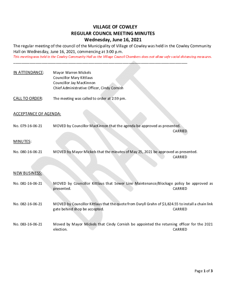 VILLAGE OF COWLEY REGULAR COUNCIL MEETING MINUTES Wednesday, June 16, 2021, The regular meeting of the council of the Municipality of Village of Cowley was held in the Cowley Community Hall on Wednesday,