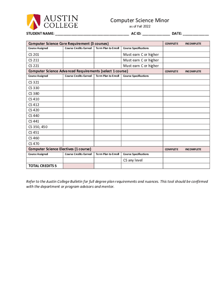 Computer Science Minor as of Fall 2022STUDENT NAME: ___ AC ID: ___ DATE: ___ Computer Science Core Requirement (3 courses)COMPLETEINCOMPLETECS 201 Must earn C or higher CS 211 Must earn C or higher