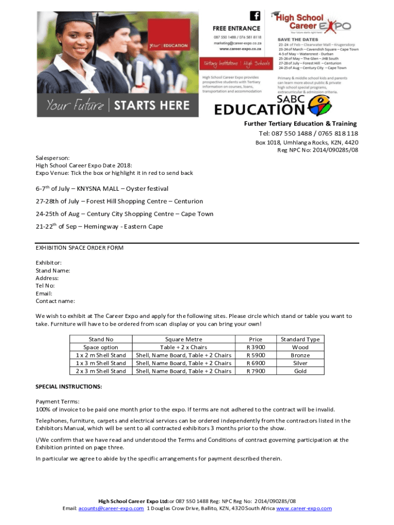 Further Tertiary Education & Training Tel: 087 550 1488 / 0765 818 118 Box 1018, Melange Rocks, KIN, 4420 Reg NPC No: 2014/090285/08 Salesperson: High School Career Expo Date 2018: Expo Venue: Tick