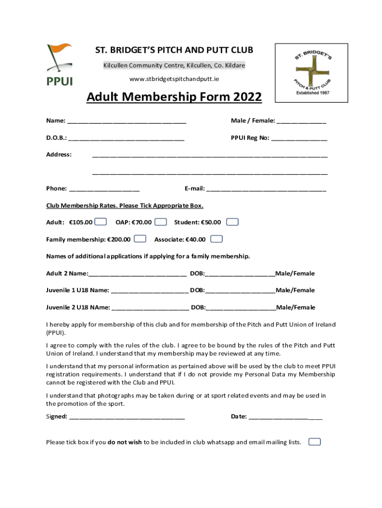 ST. BRIDGES PITCH AND PUTT CLUB Cullen Community Center, Cullen, Co. Kildare www.stbridgetspitchandputt.ieAdult Membership Form 2022 Name: ___Male / Female: ___D. O.B.: ___PPI Reg No: ___Address:___