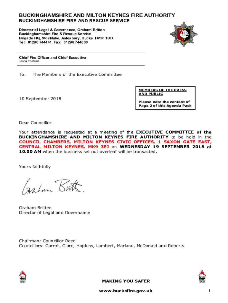 BUCKINGHAMSHIRE AND MILTON KEYNES FIRE AUTHORITY BUCKINGHAMSHIRE FIRE AND RESCUE SERVICE Director of Legal & Governance, Graham Britten Buckingham shire Fire & Rescue Service Brigade HQ, Stock lake,