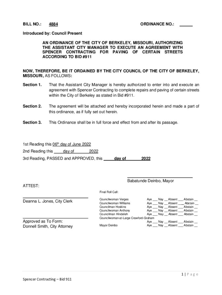 BILL NO.:4884ORDINANCE NO.:Introduced by: Council Present AN ORDINANCE OF THE CITY OF BERKELEY, MISSOURI, AUTHORIZING THE ASSISTANT CITY MANAGER TO EXECUTE AN AGREEMENT WITH SPENCER CONTRACTING FOR