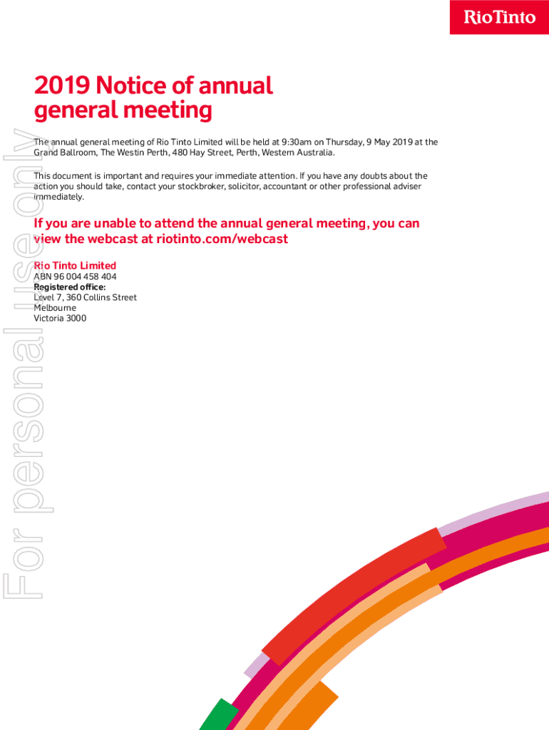 For personal use only2019 Notice of annual general meeting The annual general meeting of Rio Tinto Limited will be held at 9:30am on Thursday, 9 May 2019 at the Grand Ballroom, The Weston Perth, 480