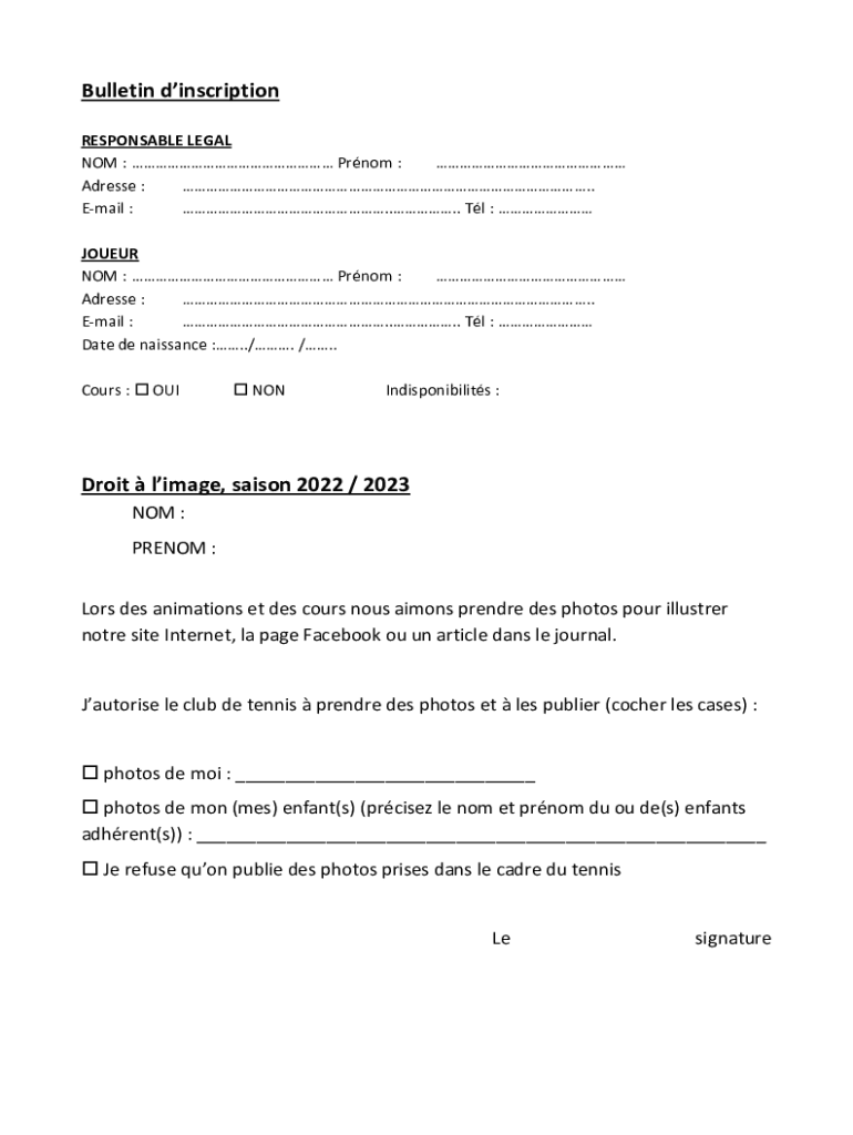 Bulletin inscription RESPONSIBLE LEGAL NOT : Prom : Address : . Email : .... Tl : JOKER NOT : Prom : Address