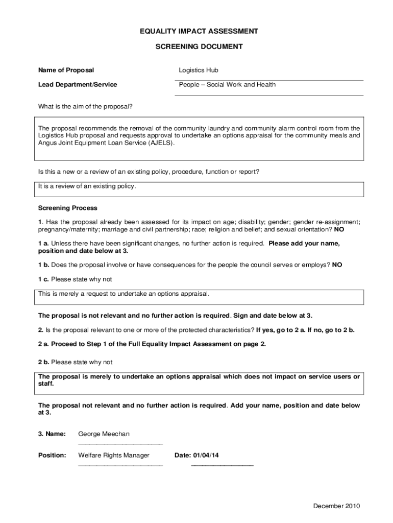 EQUALITY IMPACT ASSESSMENT SCREENING Documentary of ProposalLogistics Hulled Department/ServicePeople Social Work and Healthiest is the aim of the proposal? The proposal recommends the removal of
