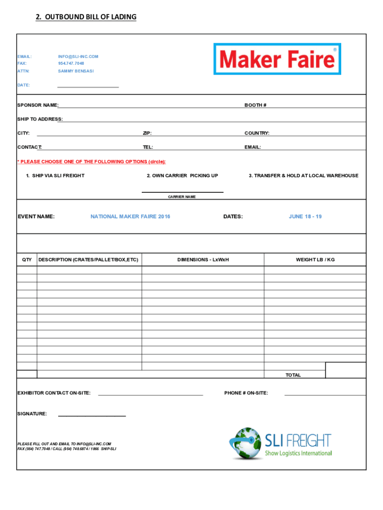 2.OUTBOUND BILL OF LADINGEMAIL:INFO@SLIINC.COLFAX:954.747.7048ATTN:SAMMY BENSASIDATE:SPONSOR NAME:BOOTH #SHIP TO ADDRESS: CITY:ZIP:COUNTRY:CONTACT:TEL:EMAIL:* PLEASE CHOOSE ONE OF THE FOLLOWING OPTIONS