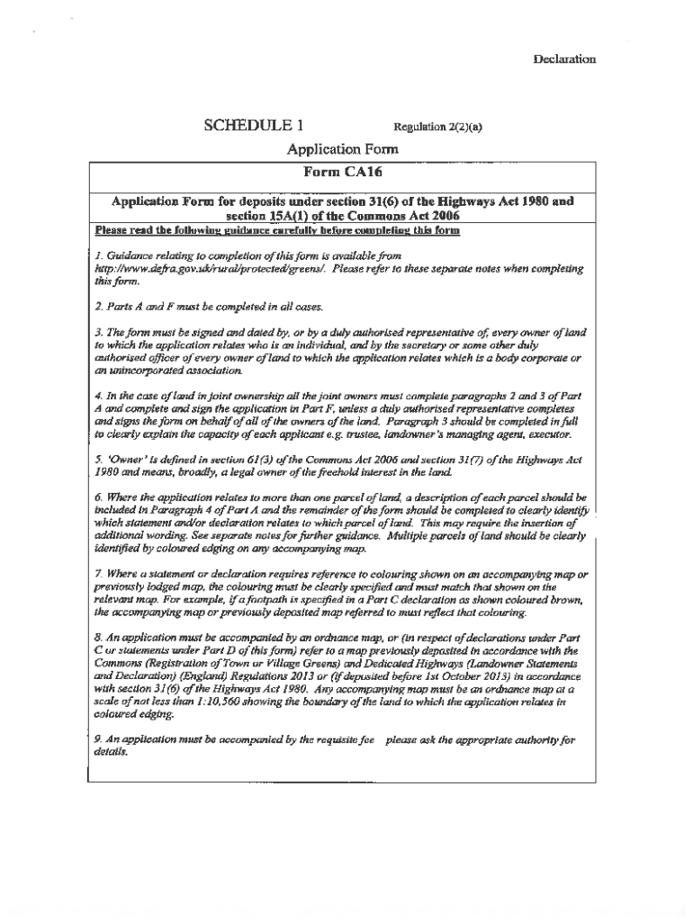 DeclarationSCHEDULE 1Regulation 2(2)(a)Application Form CA16 Application Form for deposits under section 3 1(6) of the Highways Act 1980 and section 15A(1) of the Commons Act 2006 Please read the