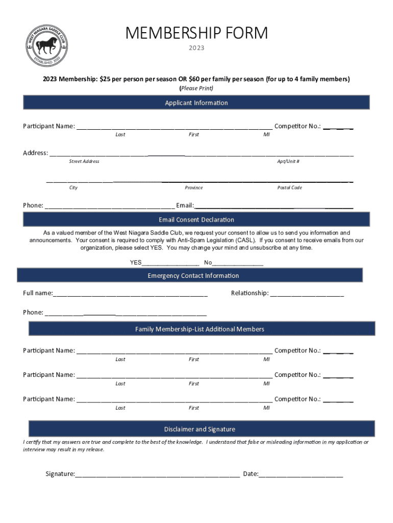 MEMBERSHIP FORM 20232023 Membership: $25 per person per season OR $60 per family per season (for up to 4 family members) (Please Print)Applicant Information Participant Name: ___ Competitor No.: __
