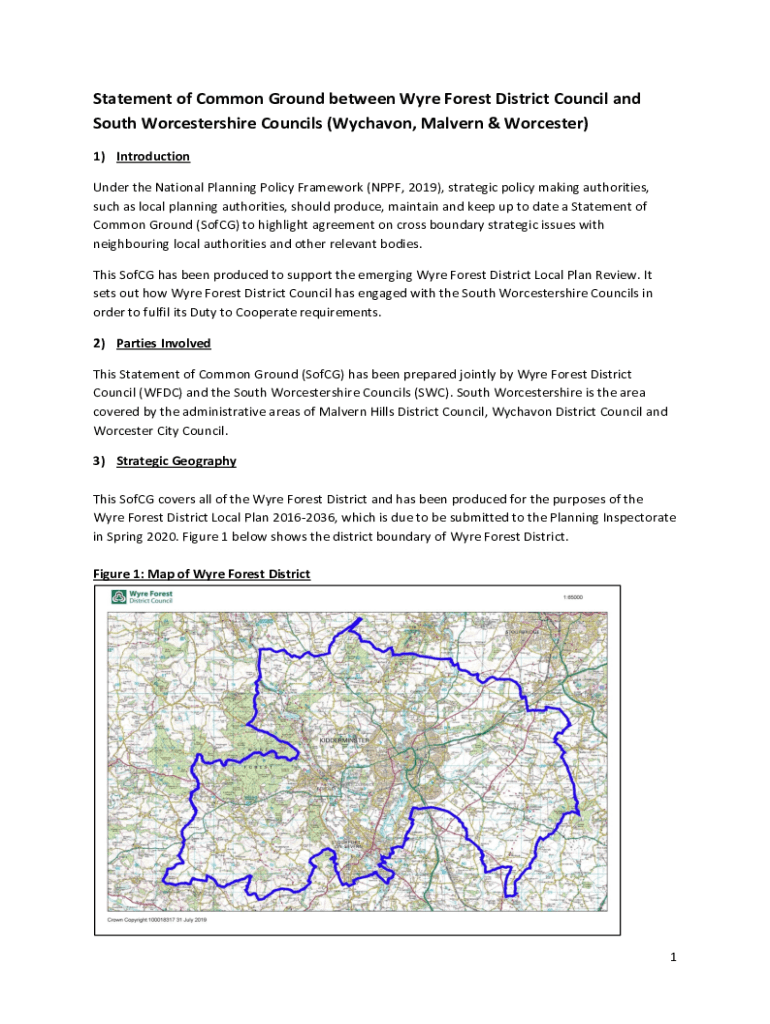Statement of Common Ground between Were Forest District Council and South Worcestershire Councils (Wychavon, Tavern & Worcester) 1) Introduction Under the National Planning Policy Framework (NPF,