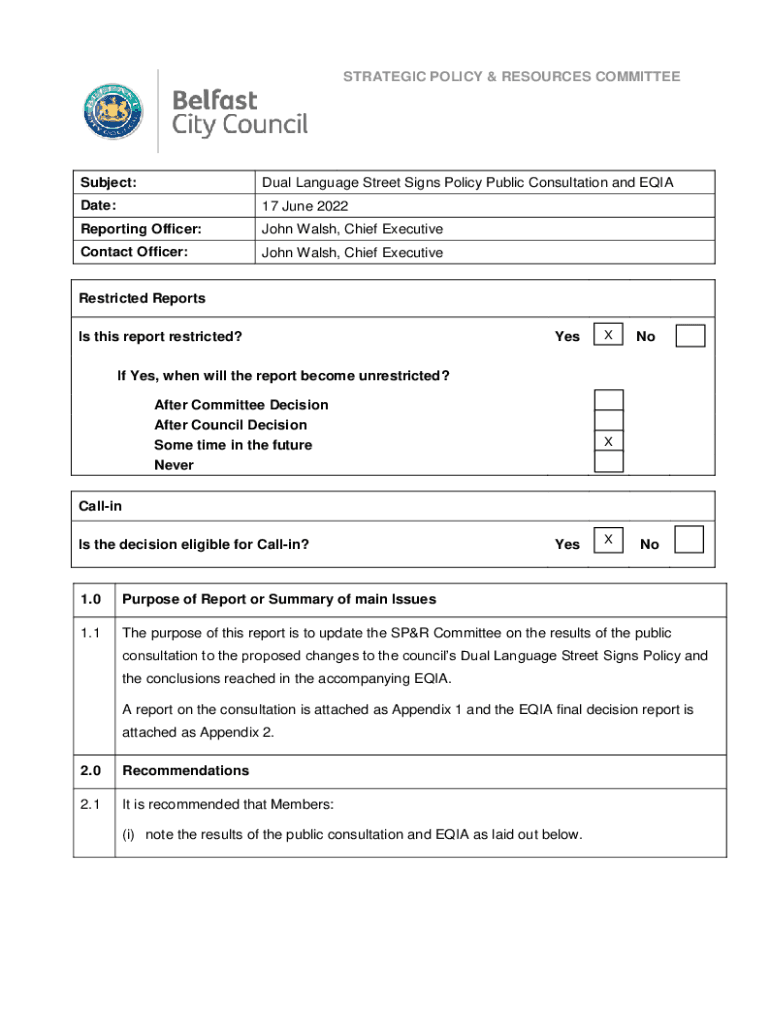 STRATEGIC POLICY & RESOURCES COMMITTEESubject:Dual Language Street Signs Policy Public Consultation and Emigrate:17 June 2022Reporting Officer:John Walsh, Chief ExecutiveContact Officer:John Walsh,
