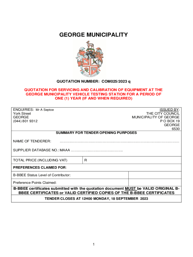 GEORGE MUNICIPALITYQUOTATION NUMBER: COM025/2023 q QUOTATION FOR SERVICING AND CALIBRATION OF EQUIPMENT AT THE GEORGE MUNICIPALITY VEHICLE TESTING STATION FOR A PERIOD OF ONE (1) YEAR (IF AND WHEN