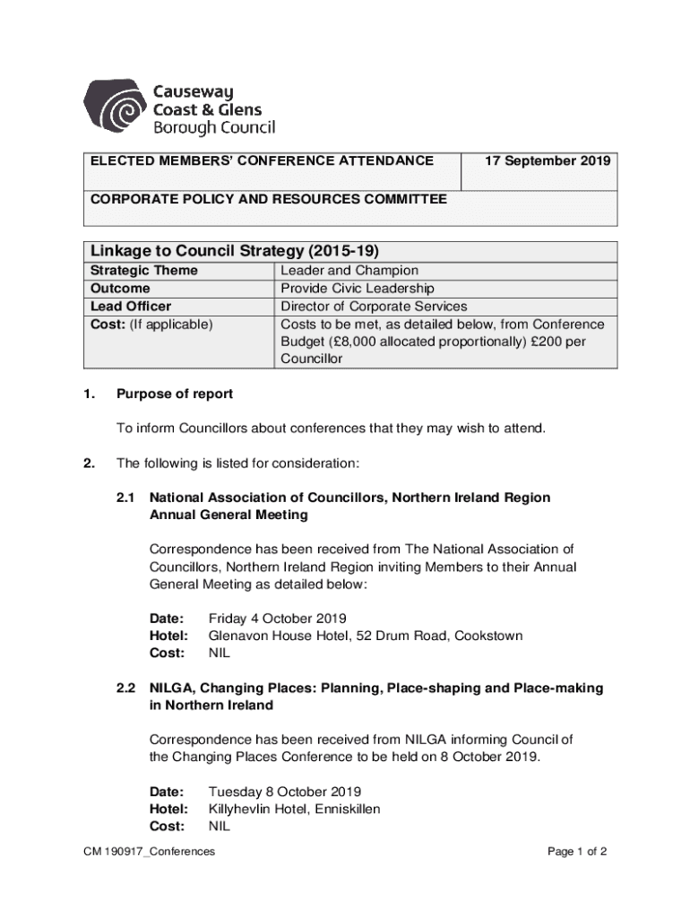 ELECTED MEMBERS CONFERENCE ATTENDANCE17 September 2019CORPORATE POLICY AND RESOURCES COMMITTEELinkage to Council Strategy (201519) Strategic Theme Outcome Lead Officer Cost: (If applicable)1. Leader