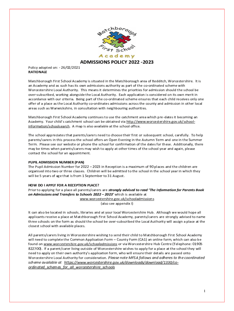 ADMISSIONS POLICY 2022 2023 Policy adopted on: 26/02/2021 RATIONALE Match borough First School Academy is situated in the Match borough area of Red ditch, Worcestershire. It is an Academy and as such
