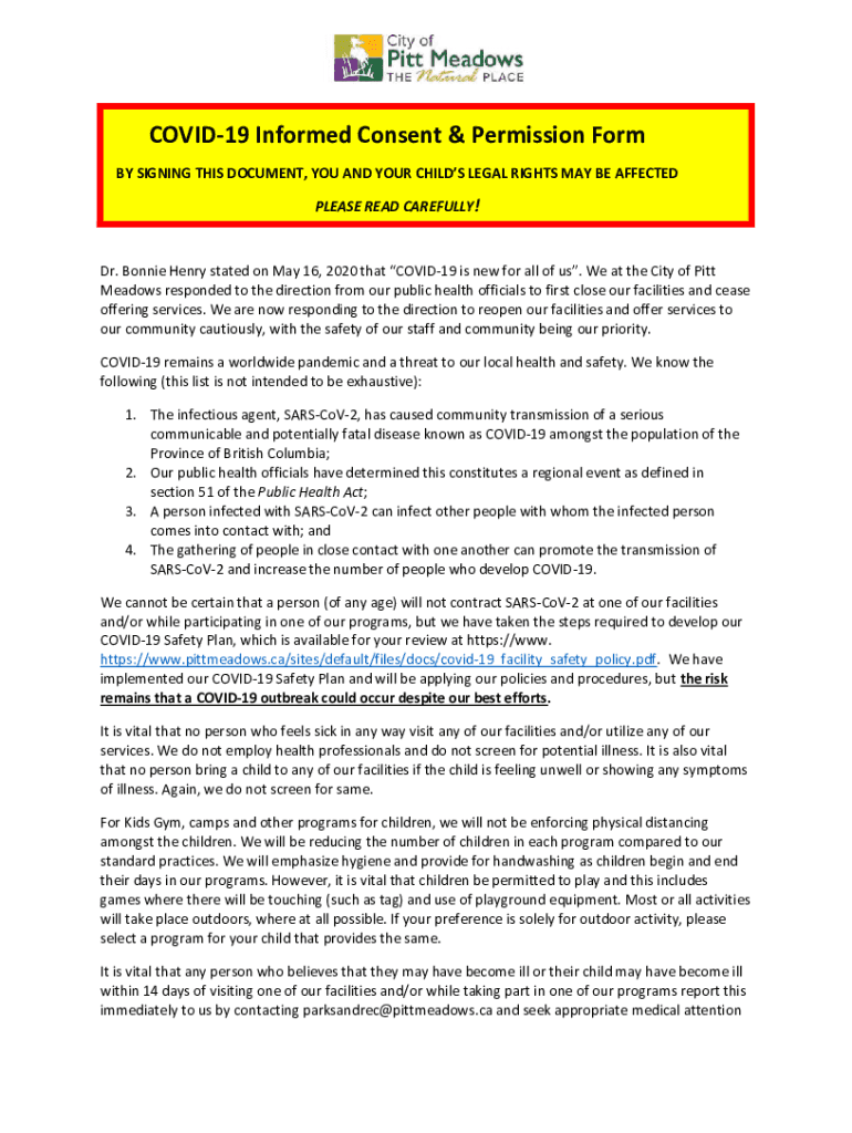 COVID-19 Informed Consent & Permission Form BY SIGNING THIS DOCUMENT, YOU AND YOUR CHILD LEGAL RIGHTS MAY BE AFFECTED PLEASE READ CAREFULLY! Dr. Bonnie Henry stated on May 16, 2020, that COVID-19