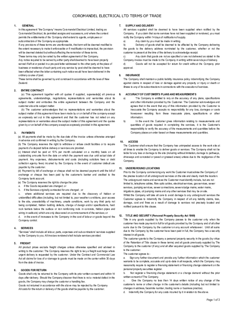 COMMANDER ELECTRICAL LTD TERMS OF TRADE 1.2.3.GENERAL In this agreement the Company means Commander Electrical Limited, trading as Commander Electrical, its permitted assigns and successors, and where