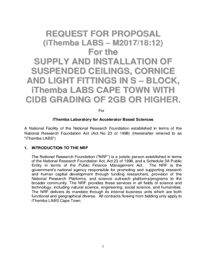 REQUEST FOR PROPOSAL(them LABS M2017/18:12)For the SUPPLY AND INSTALLATION OF SUSPENDED CEILINGS, CORNICE AND LIGHT FITTINGS IN S BLOCK, them LABS CAPE TOWN WITH CDB GRADING OF 2 GB OR HIGHER. For