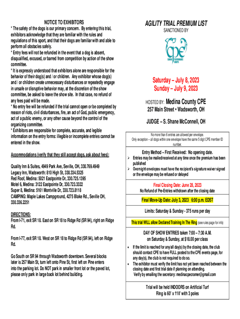 NOTICE TO EXHIBITORSAGILITY TRIAL PREMIUM LIST* The safety of the dogs is our primary concern. By entering this trial, exhibitors acknowledge that they are familiar with the rules and regulations