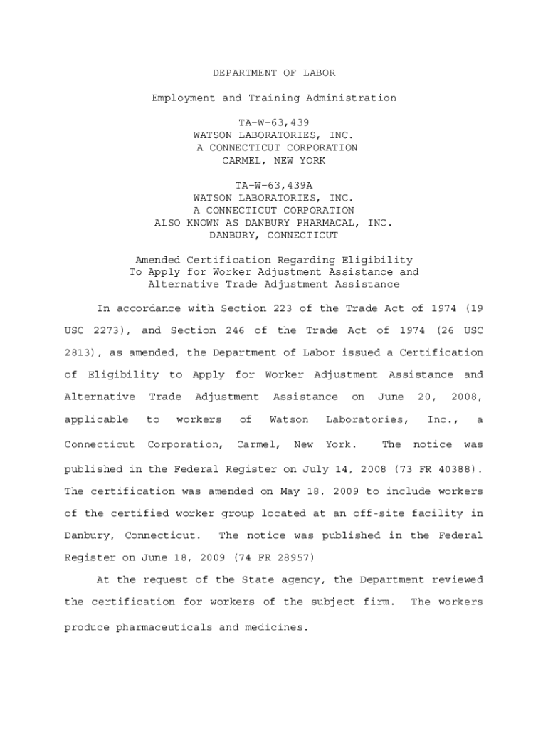 DEPARTMENT OF LABOR Employment and Training Administration TAW63,439 WATSON LABORATORIES, INC. A CONNECTICUT CORPORATION CARMEL, NEW YORK TAW63,439A WATSON LABORATORIES, INC. A CONNECTICUT CORPORATION