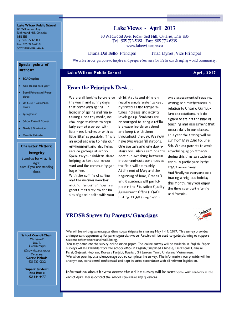 Lake Wilcox Public School 80 Wildwood Ave Richmond Hill, Ontario L4E 3B5 Tel: 905 7735381 Fax: 905 7736238 www.lakewilcox.ps.caLake Views April 2017 80 Wildwood Ave. Richmond Hill, Ontario, L4E 3B5