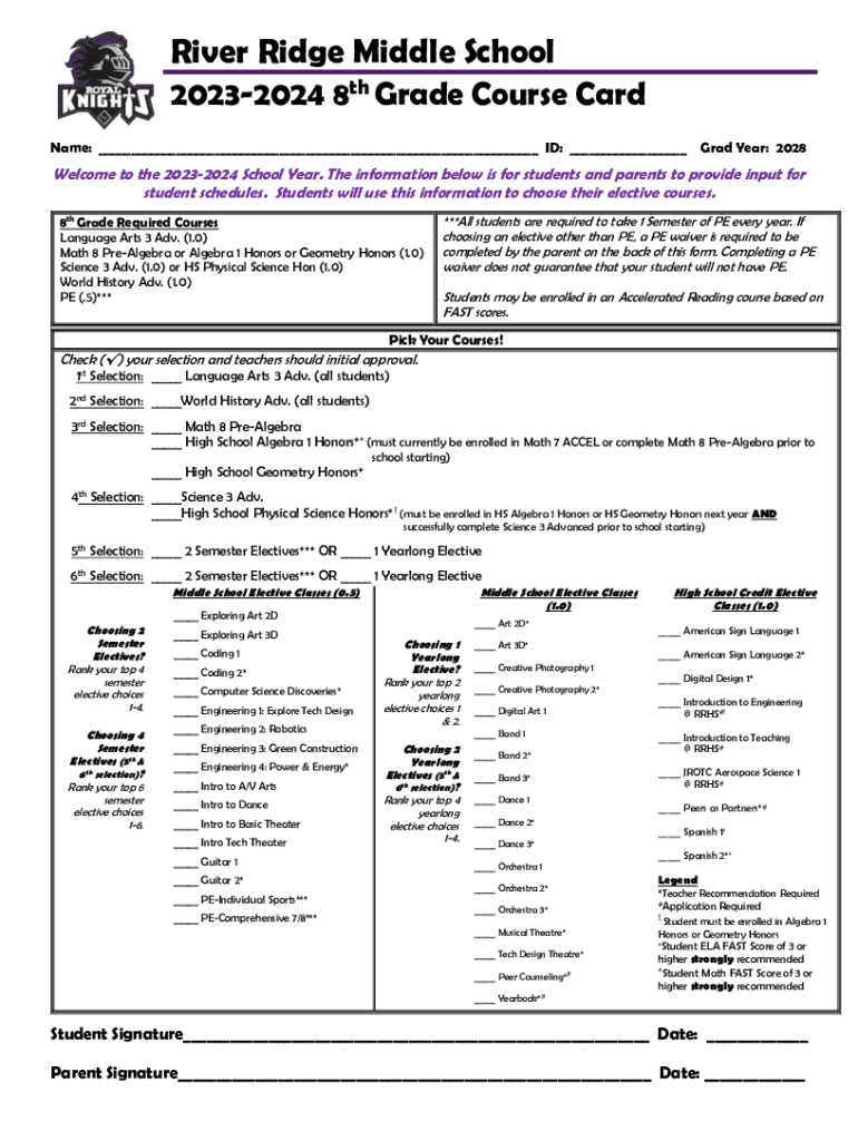 River Ridge Middle School 20232024 8th Grade Course Card Name: ___ ID: ___ Grad Year: 2028Welcome to the 20232024 School Year. The information below is for students and parents to provide input for