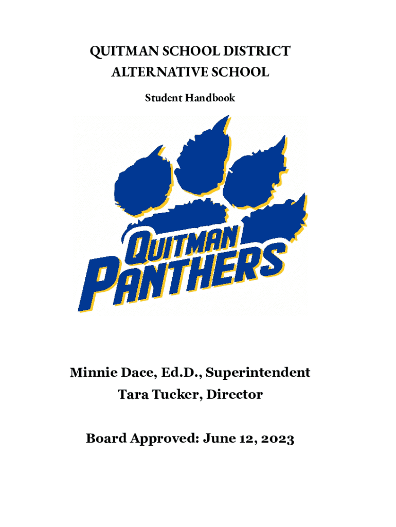 WHITMAN SCHOOL DISTRICT ALTERNATIVE SCHOOL Student Handbook Minnie Dace, Ed. D., Superintendent Tara Tucker, Director Board Approved: June 12, 2023TABLE OF CONTENTS WHITMAN PUBLIC SCHOOL DISTRICT4QSD