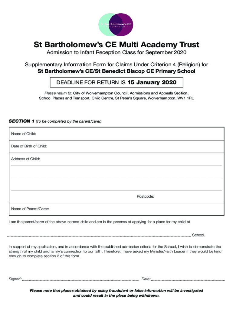 St Bartholomew's CE Multi Academy Trust Admission to Infant Reception Class for September 2020 Supplementary Information Form for Claims Under Criterion 4 (Religion) for St Bartholomew's CE/St Benedict