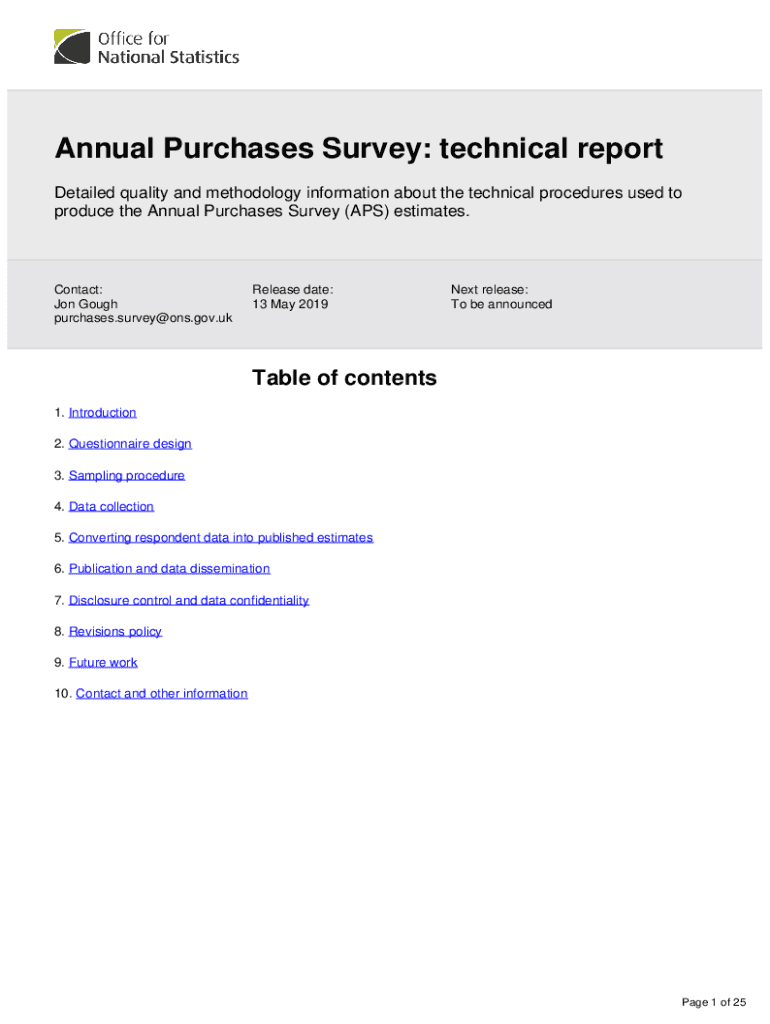 Annual Purchases Survey: technical report Detailed quality and methodology information about the technical procedures used to produce the Annual Purchases Survey (APS) estimates. Contact: Jon Golf