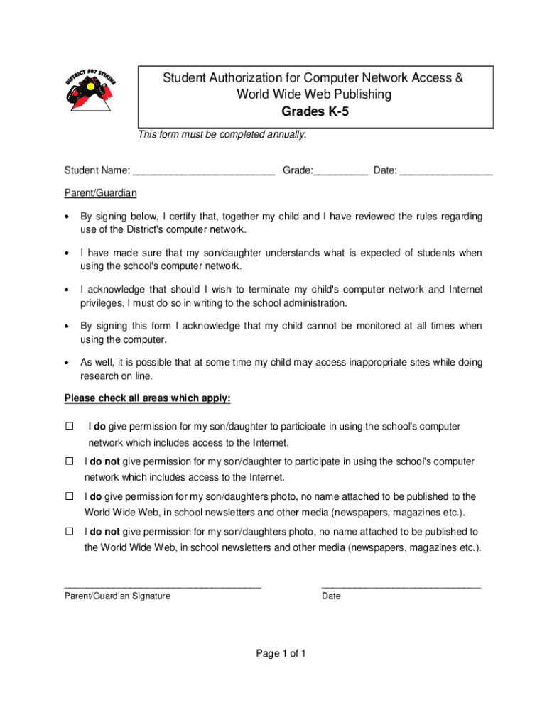 Student Authorization for Computer Network Access & World Wide Web Publishing Grades K5 This form must be completed annually. Student Name: ___ Grade:___ Date: ___ Parent/Guardian By signing below,