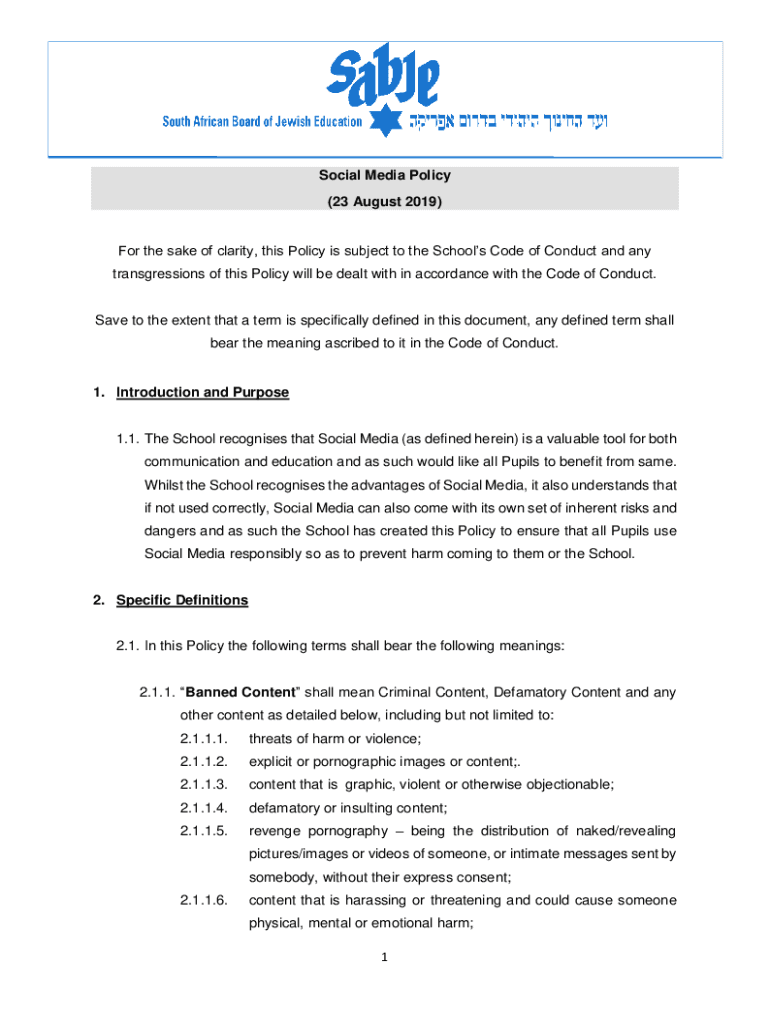Social Media Policy (23 August 2019)For the sake of clarity, this Policy is subject to the Schools Code of Conduct and any transgressions of this Policy will be dealt with in accordance with the Code