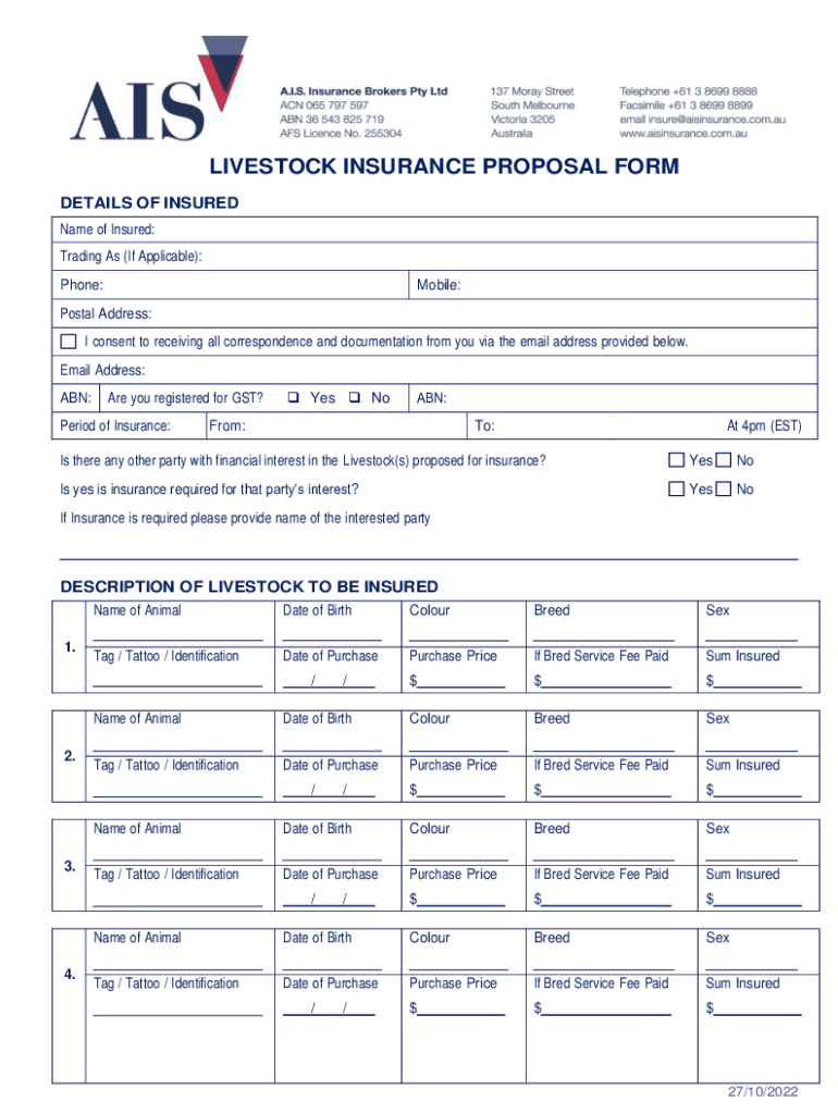 LIVESTOCK INSURANCE PROPOSAL FORM DETAILS OF INSURED Name of Insured: Trading As (If Applicable): Phone:Mobile:Postal Address: I consent to receiving all correspondence and documentation from you