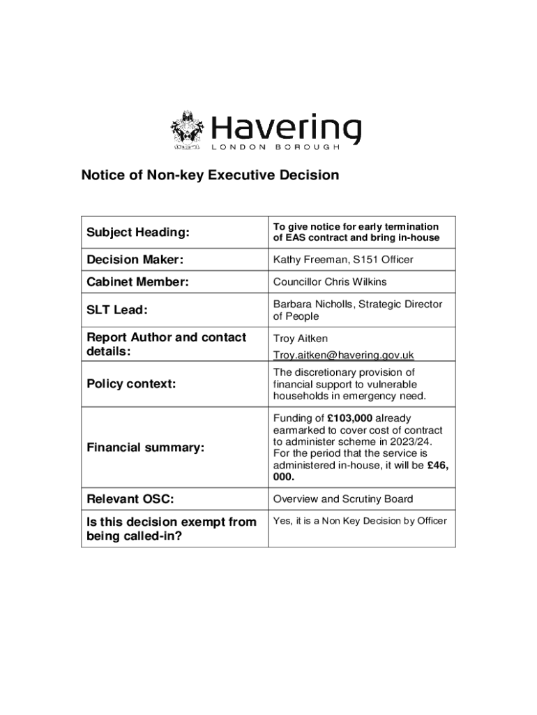 of EAS contract and bring inhouseDecision Maker:Kathy Freeman, S151 OfficerCabinet Member:Councillor Chris Wilkins