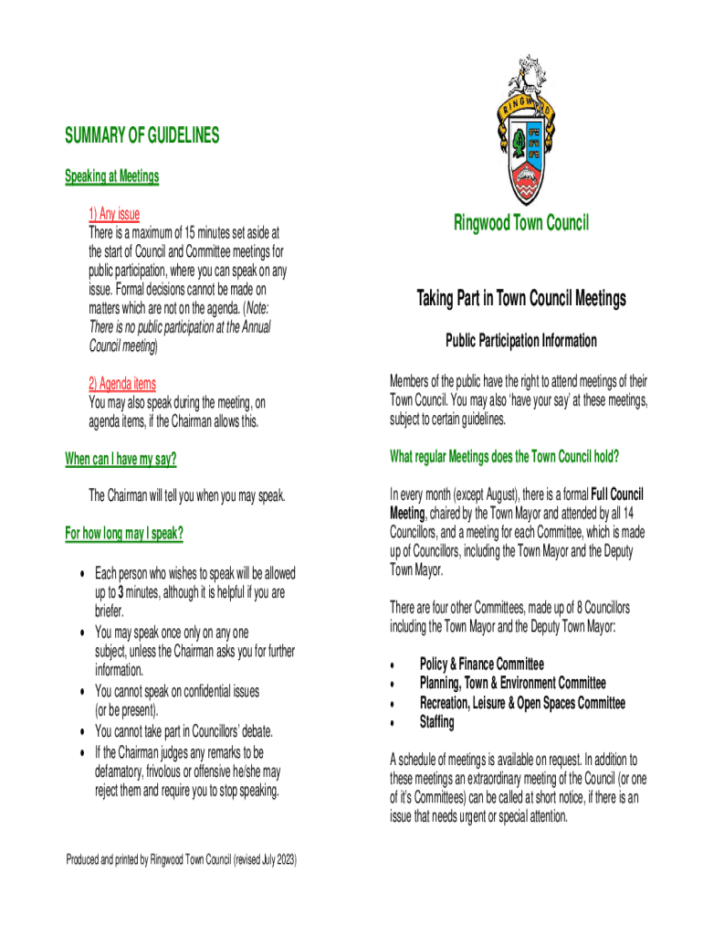 SUMMARY OF GUIDELINES Speaking at Meetings 1) Any issue There is a maximum of 15 minutes set aside at the start of Council and Committee meetings for public participation, where you can speak on any