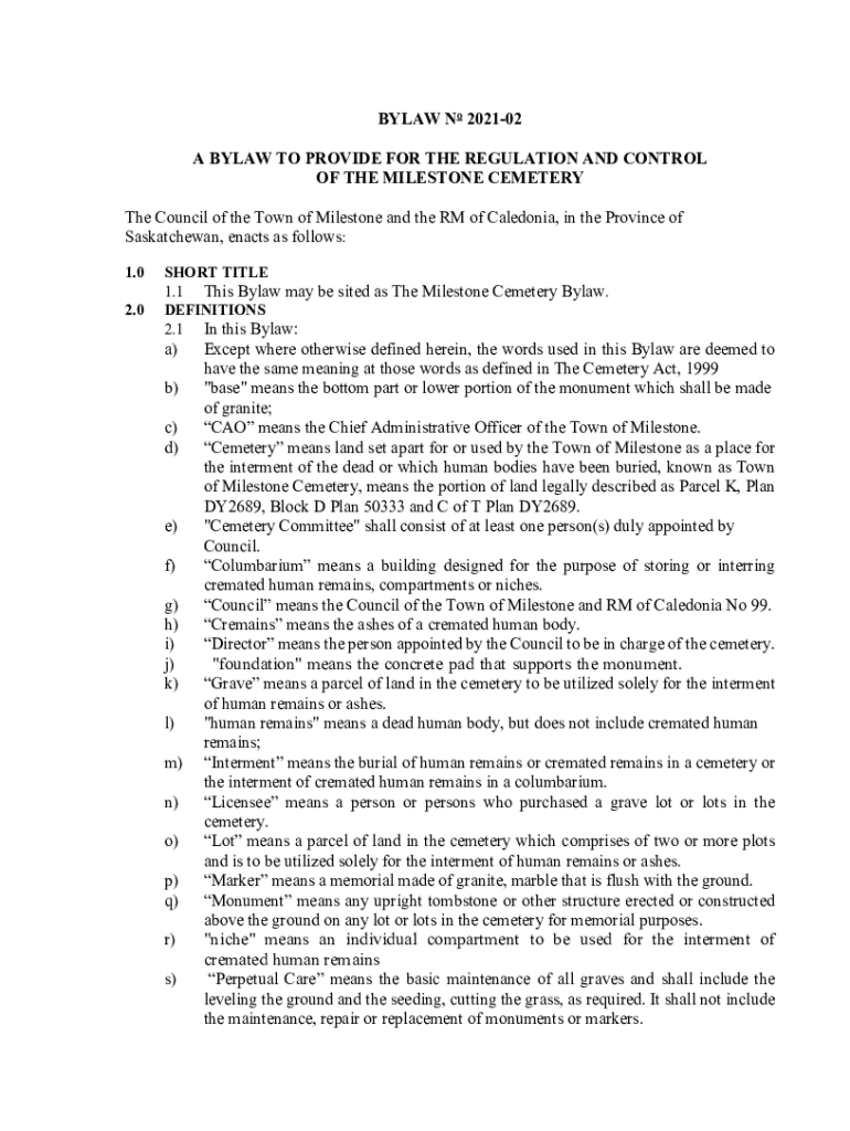 BYLAW No 202102 A BYLAW TO PROVIDE FOR THE REGULATION AND CONTROL OF THE MILESTONE CEMETERY The Council of the Town of Milestone and the RM of Caledonia, in the Province of Saskatchewan, enacts as