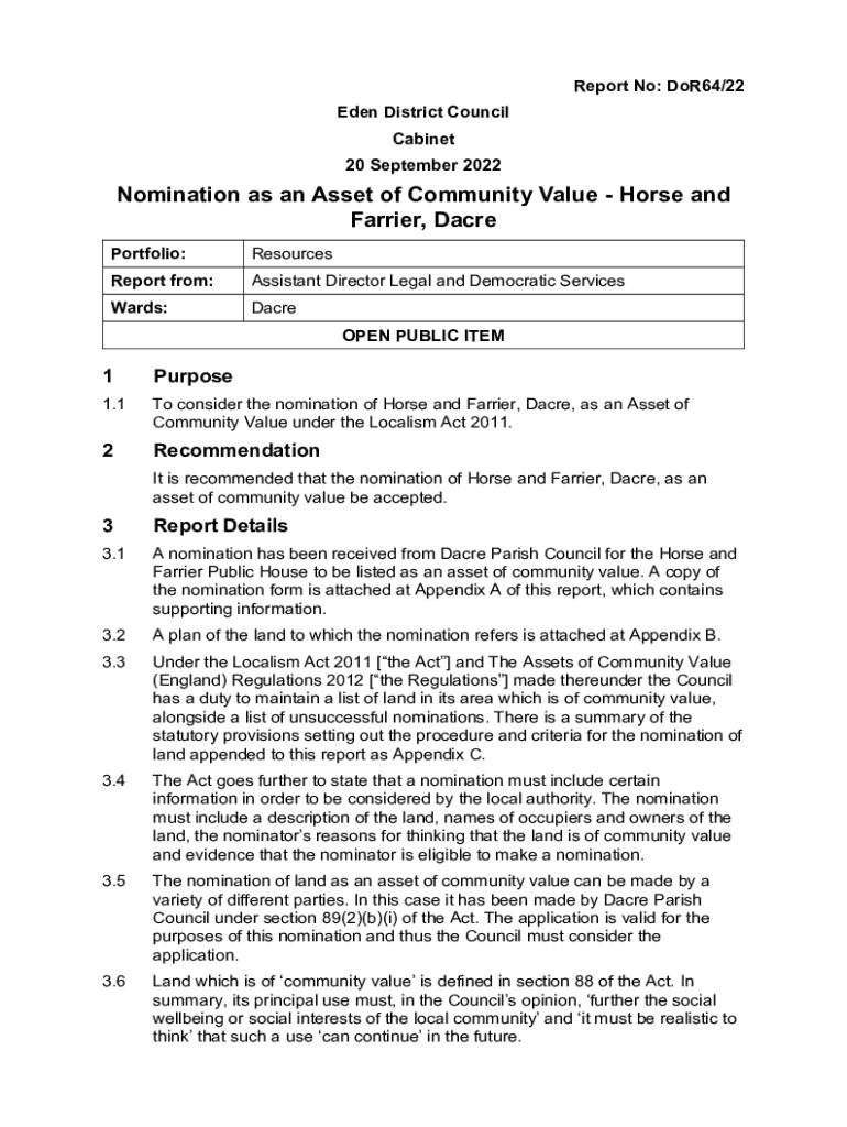 Report No: DoR64/22 Eden District Council Cabinet 20 September 2022Nomination as an Asset of Community Value Horse and Farrier, Acre Portfolio:ResourcesReport from:Assistant Director Legal and Democratic