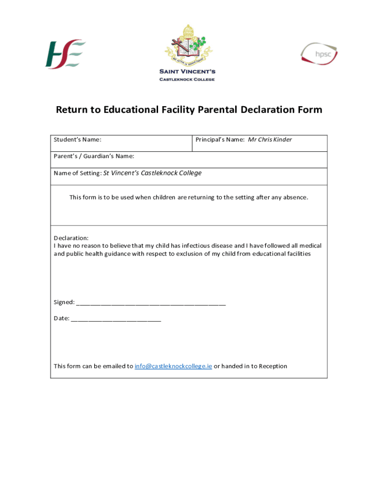 Return to Educational Facility Parental Declaration Form Students Name:Principals Name: Mr Chris Kindergartens / Guardians Name: Name of Setting: St Vincent's Castle knock Colleges form is to be used