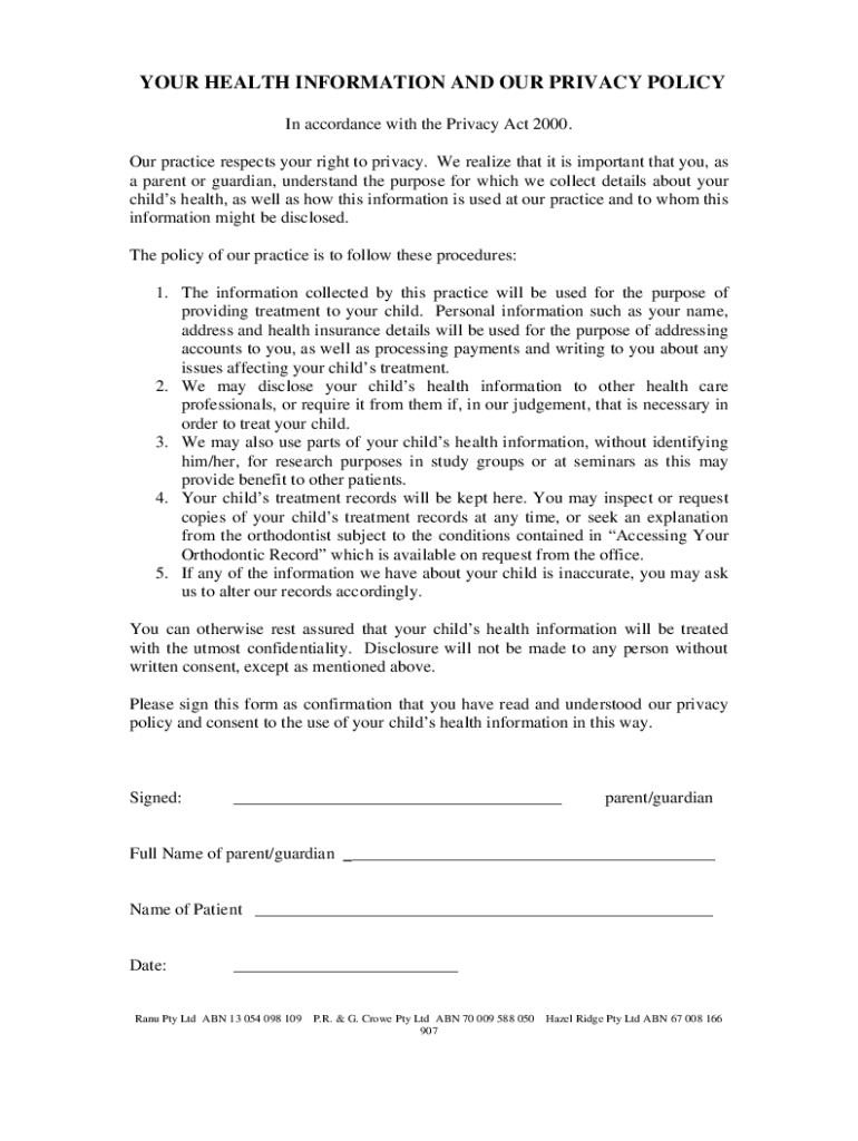YOUR HEALTH INFORMATION AND OUR PRIVACY POLICY In accordance with the Privacy Act 2000. Our practice respects your right to privacy. We realize that it is important that you, as a parent or guardian,
